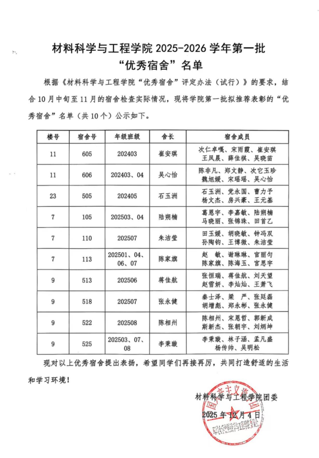 本次“优秀宿舍”评选活动是根据《太阳集团1088vip“优秀宿舍”评定办法》的相关要求,结合学院2025年10月中旬至11月份宿舍检查的实际情况,通过每周对学院全体宿舍的安全、卫生等进行严格的检查,并量化打分,确保整个评选过程公平公正。最后评选出本学年第一批“优秀宿舍”共10间,分别是11#605、11#606、23#505、7#105、7#110、7#113、9#513、9#518、9#522、9#525宿舍。学院为以上“优秀宿舍”颁发了流动红旗、发放了宿舍用品奖励,并为宿舍成员在综合测评中予以适当加分。