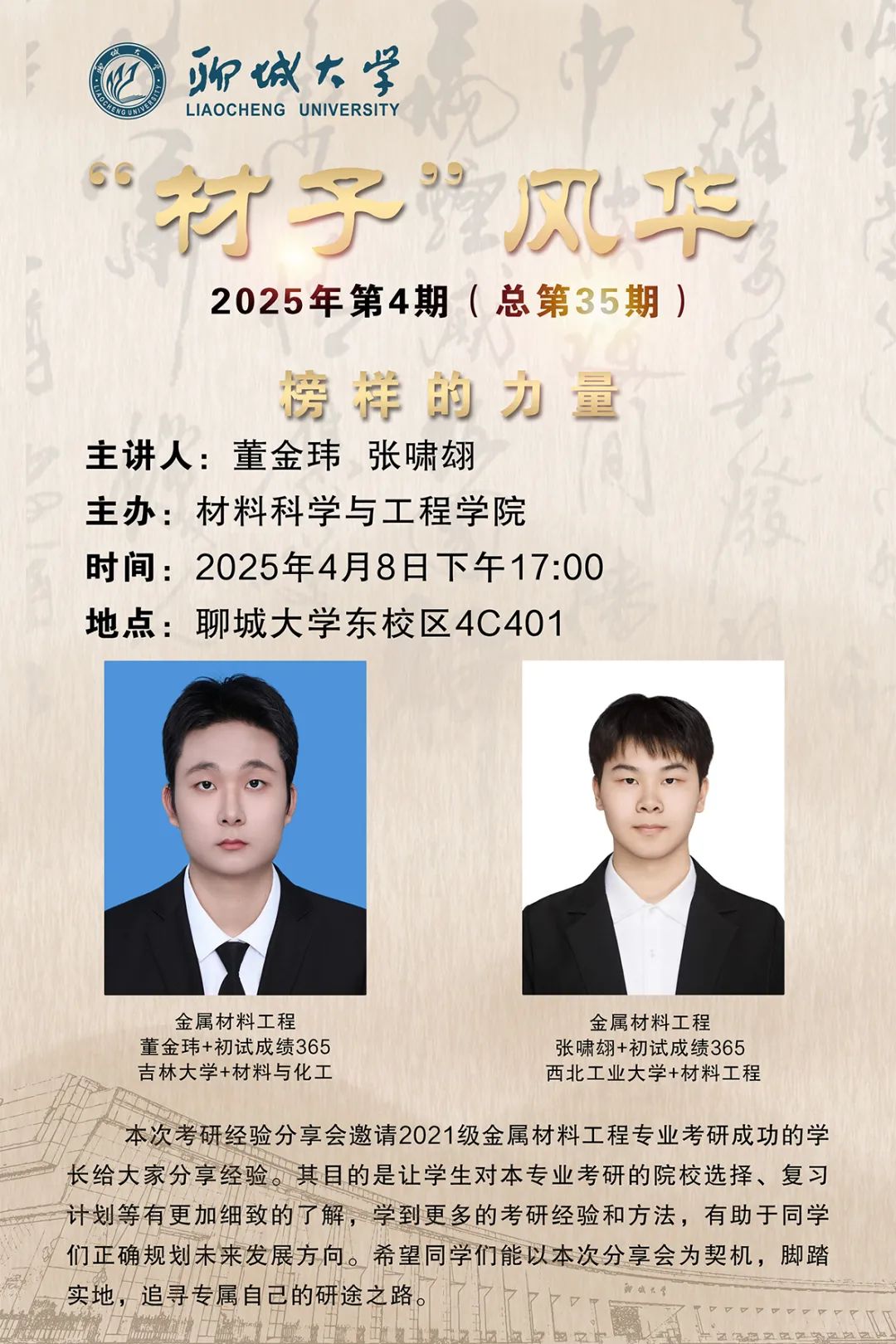 为加强学院学风建设,促进学术交流与人才培养,助力材料学子科学规划考研路径,2025年4月8日,太阳集团1088vip太阳集团1088vip于东校区4#C401开展金属材料工程专业考研经验分享交流会。本次交流会特邀2021级金属材料工程专业优秀考研学子董金玮、张啸翃担任主讲嘉宾,2022级金属材料工程专业全体同学参加。
